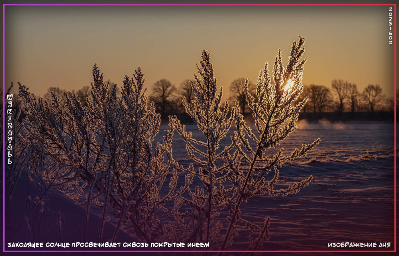 Сегодня (16-го февраля 2023 года) в рубрике изображение дня, pаходящее солнце просвечивает сквозь покрытые инеем засохшие растения в Дюльмене, Северный Рейн-Вестфалия.